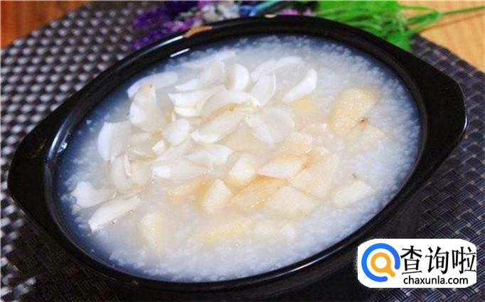 梨子洗净去皮并切成小块,百合冲洗干净后掰成小片,大米淘洗后放入锅中,加入适量水煮开,然后转小火10-15分钟,至大米粘稠时,放入百合和梨子块,再放入适量冰糖,炖至冰糖溶化即可食用。