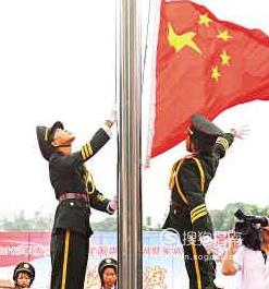 国旗随着国歌声慢慢的升到旗杆顶端,此时国歌声正好结束,所以在这里一定要把握好时间。