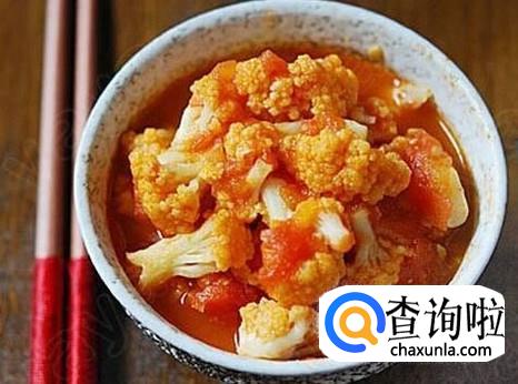 番茄花菜,花菜洗干净撕成小朵,锅中倒入适量清水烧开放花菜绰水后捞起备用,蒜头切成末,番茄用热水烫过后撕去外皮再切成丁,锅中倒入适量的油,倒入蒜末爆香,再倒入花菜翻炒片刻倒入适量的水焖一会,再加入番茄和番茄酱一起煮至收汁即可。