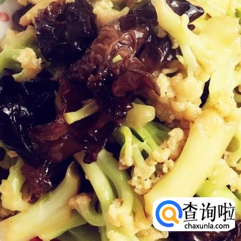 花菜炒黑木耳,木耳提前三个钟泡发后洗净备用,花菜洗净切小朵绰水备用,锅中倒入适量油再倒入花菜翻炒片刻加入木耳一起翻炒,加入适量的清水焖煮至收汁,加生抽,蚝油少许老抽调味即可。
