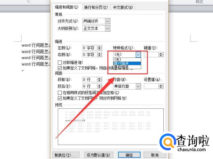 在特殊格式位置可以选择“首行缩进或者悬挂缩进或者无”,以首行缩进为例。