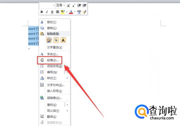 设置word行间距,需要选择调整行间距的文字内容,右击鼠标选择“段落”,进入之后即可进行设置行间距。以下用Windows10系统的Word2010操作演示一下。