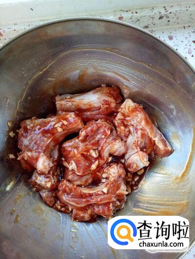 把水烧开,将排骨倒入水中焯几分钟。然后捞出,放在碗里,倒入料酒、蚝油、盐、糖,进行腌渍,大概30分钟。