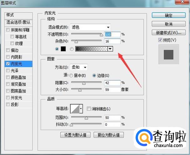 点击混合选项在弹出的对话框内选择内发光,然后设置发光的颜色为黑色,并设置参数如图所示: