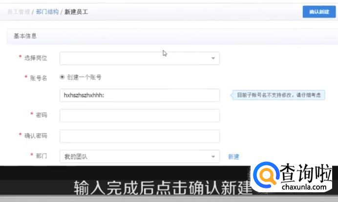我们选择好自己的角色后,先检查一下自己信息有没有填写错误的,没有的话我们点击“确认新建”,就可以创建一个子账号了。