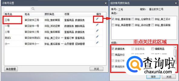 之后我们找到要修改的账号,然后点击旁边笔的图标,就会进入到修改页面中,我们去掉原来勾选的权限,选择新的权限,最后点击“确定”。