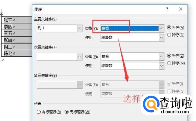 接下来会弹出排序界面,我们在主关键字的类型栏目中选择拼音即可,如下图所示