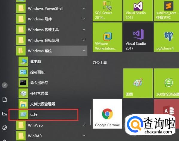 首先我们打开windows开始菜单,在里面找到运行,如下图所示