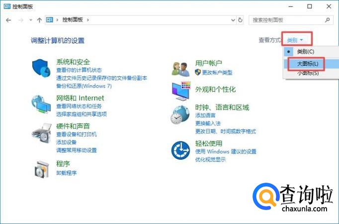 进入控制面板之后,我们将类别选择为大图标;