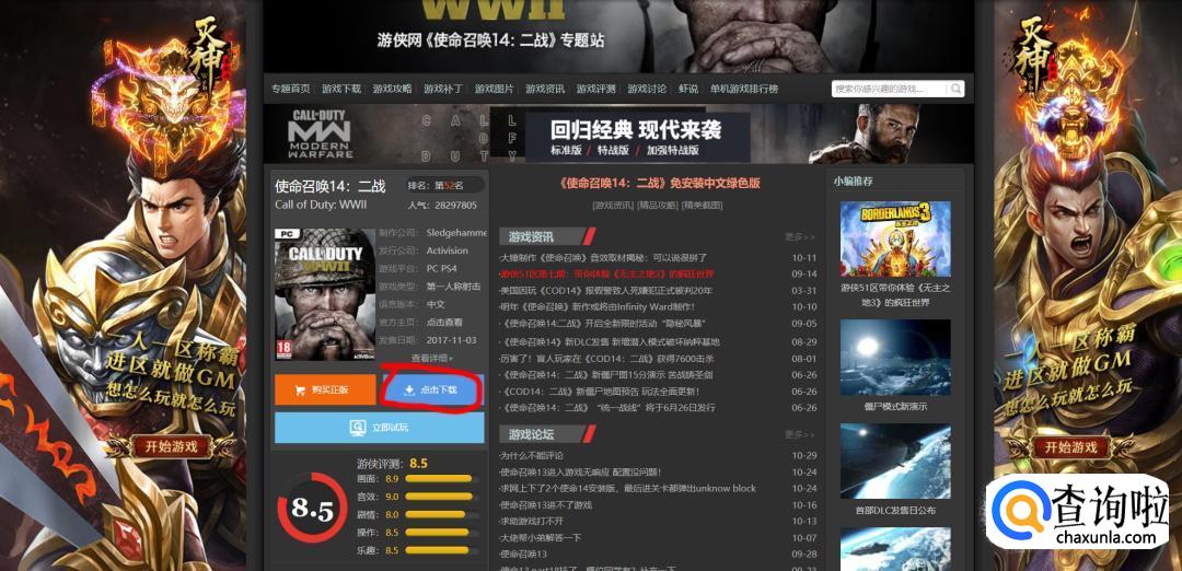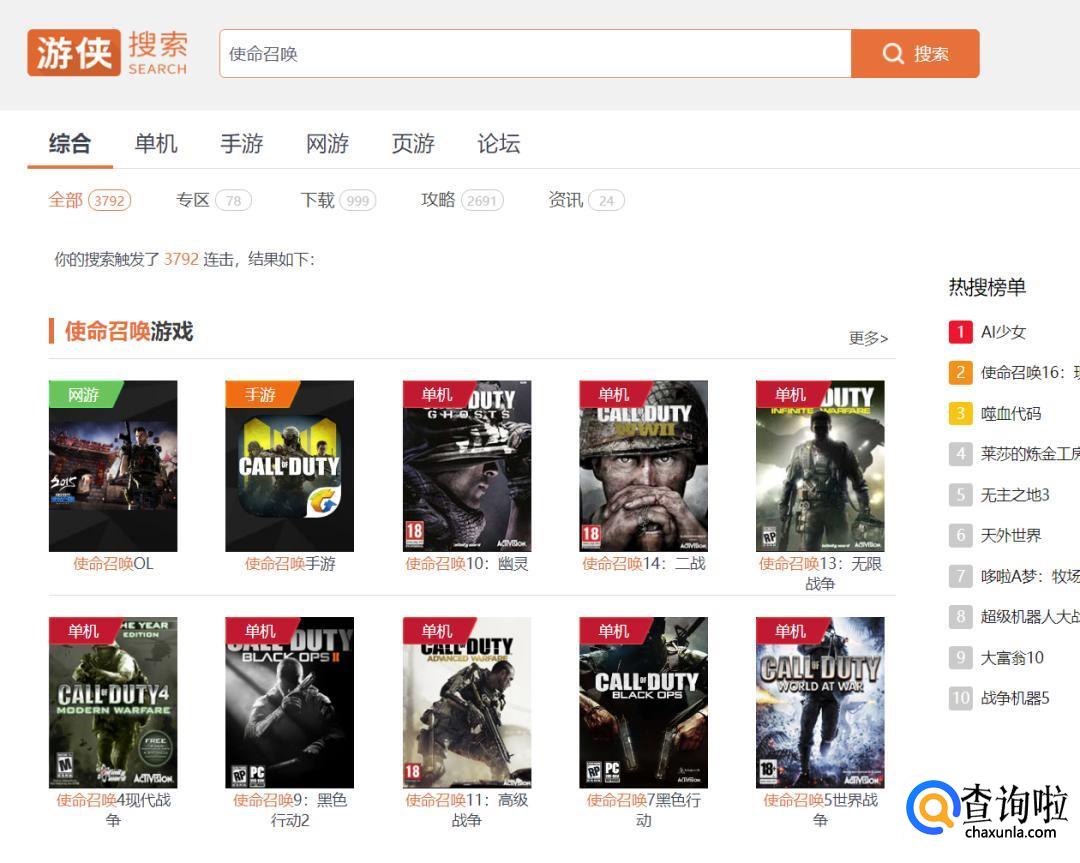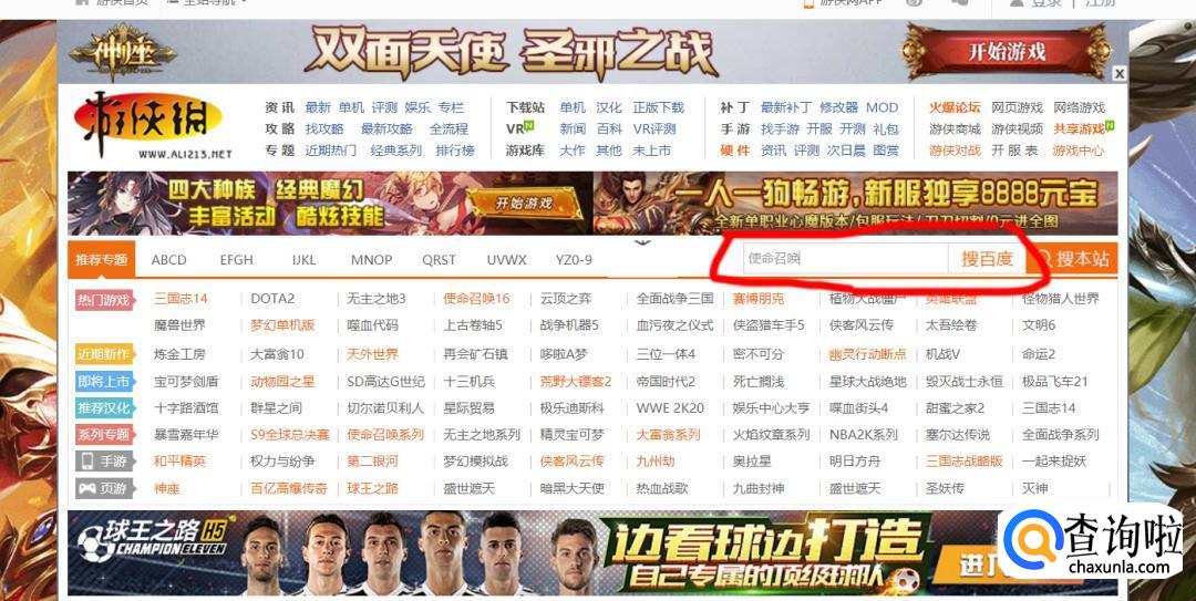 在浏览器上搜索“游侠”,选择游侠官网进入。然后搜索“使命召唤”。