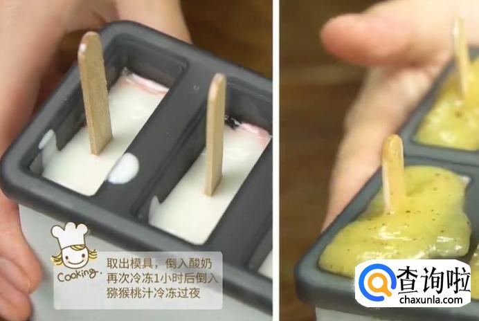 取出模具,倒入酸奶,冷冻一小时后取出,再倒入猕猴桃汁冷冻一夜。