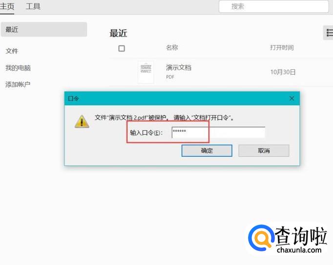在使用PDF阅读软件打开加密文件的过程中,会弹出密码输入框,填入PDF密码,点击确定按钮。