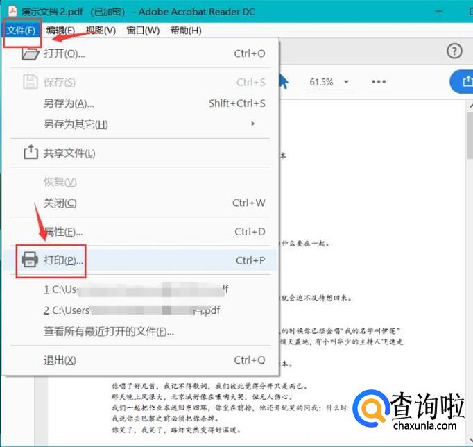在阅读软件中,点按菜单栏的“文件”,在下拉菜单中点击“打印”命令。