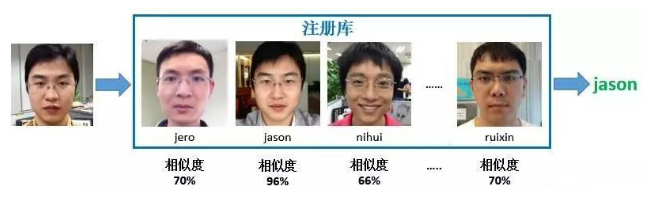 它的输入一个人脸特征,通过和注册在库中N个身份对应的特征进行逐个比对,找出“一个”与输入特征相似度最高的特征。将这个最高相似度值和预设的阈值相比较,如果大于阈值,则返回该特征对应的身份,否则返回“不在库中”。