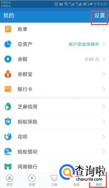 首先,我们登录我们的支付宝,然后我们点击我的,之后我们点击右上角的设置;