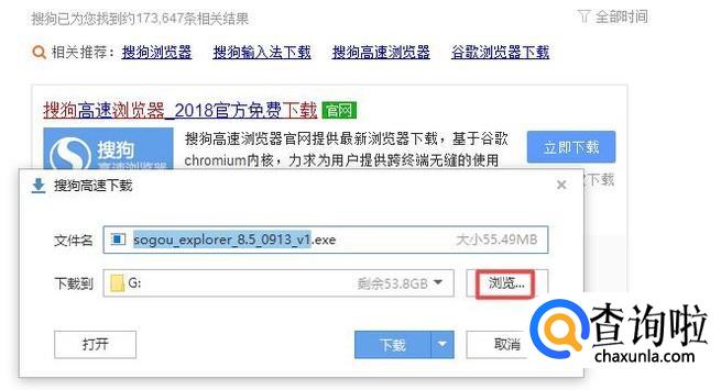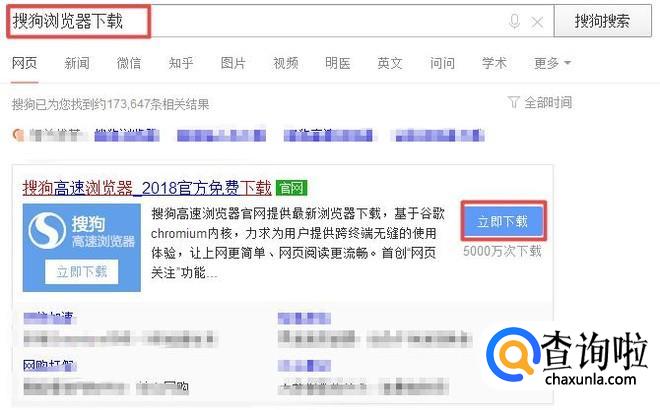 之后我们输入一个软件进行下载,我们输入搜狗浏览器下载,然后按回车键,弹出的界面,我们点击立即下载;