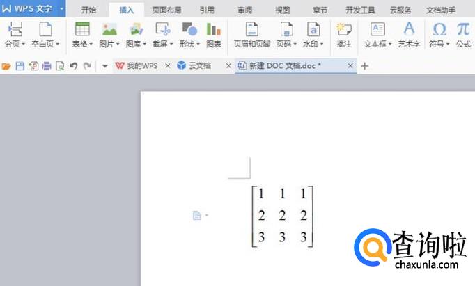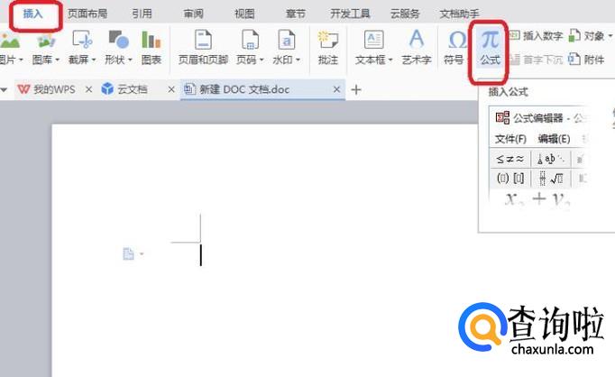 然后,我们用WPS文字打开我们正在编辑的文档,光标移至需要插入矩阵处,点击“插入”,“公式”。