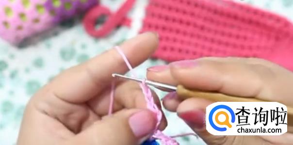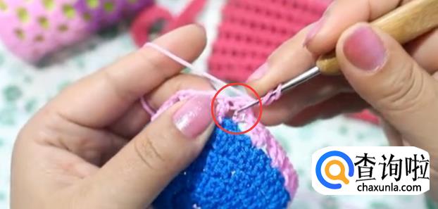 从第一行下面长一点的洞里面处穿过钩一个长针。