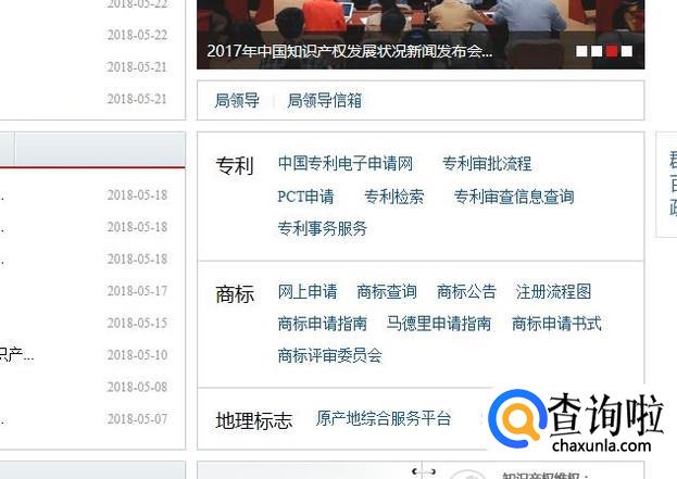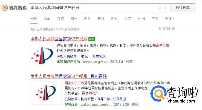 首先我们先使用搜狗浏览器在搜索引擎中输入中华人民共和国知识产权局,然后点击查询,找到官方的网站点击进入。