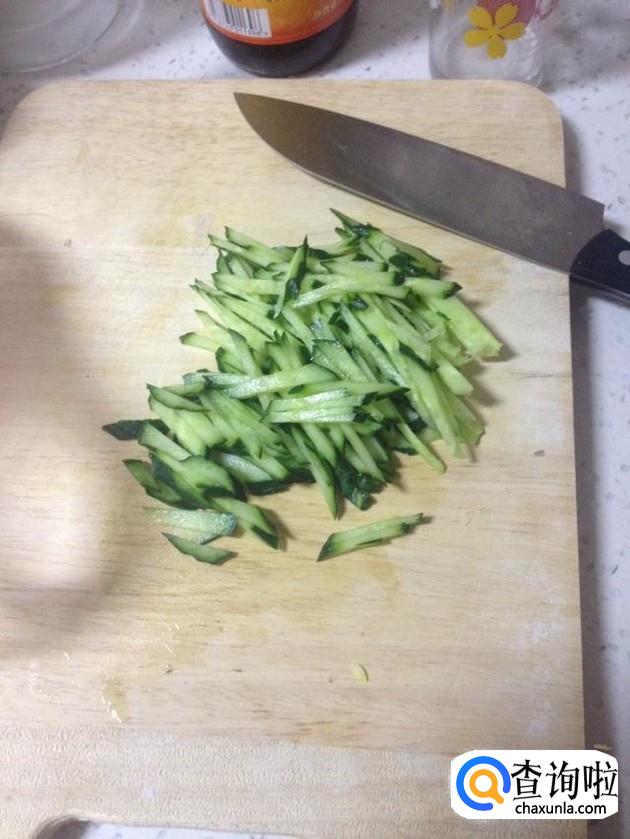 先将黄瓜洗干净然后切丝备用,大蒜去皮切末备用。如果想放点香肠的话也可以准备一根香肠,像切黄瓜一样切成条。