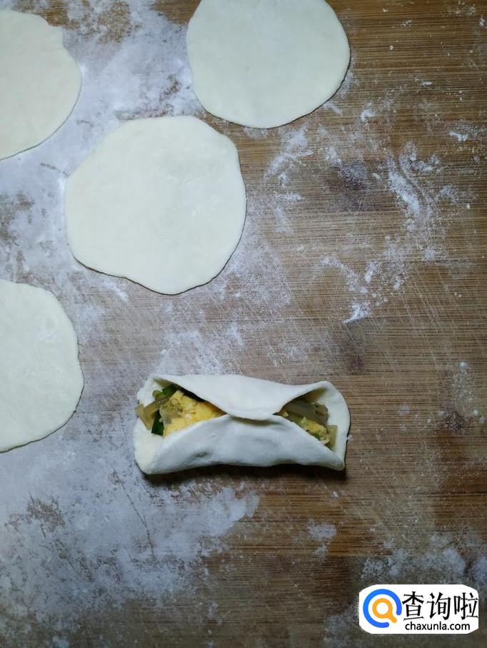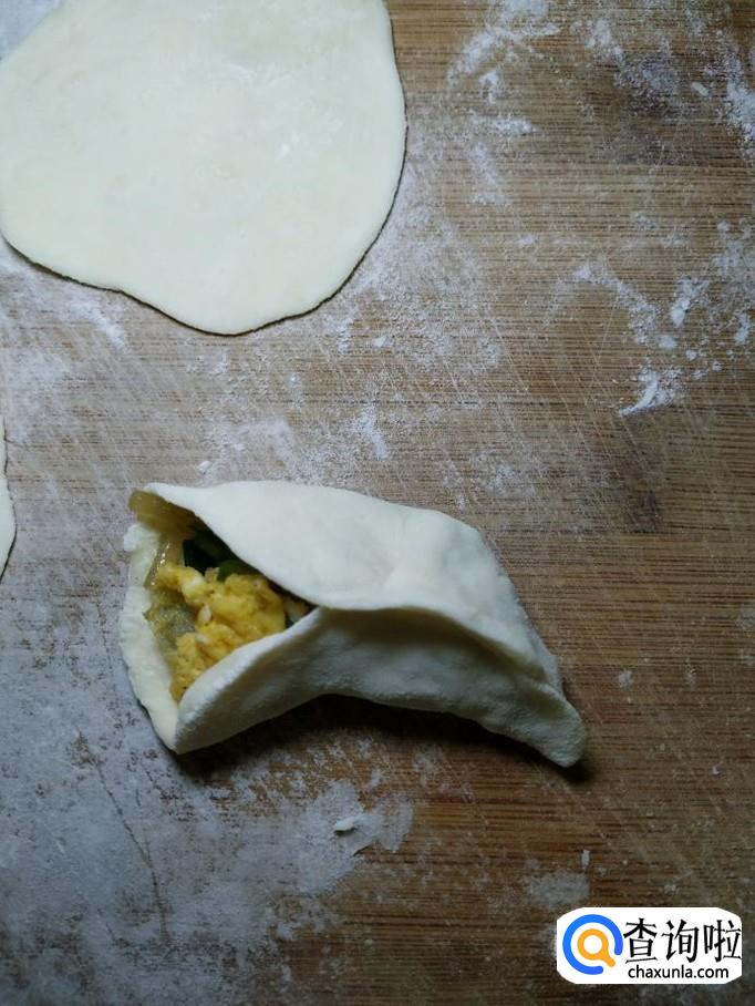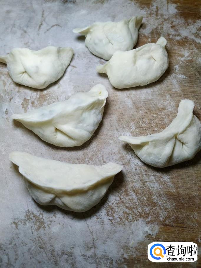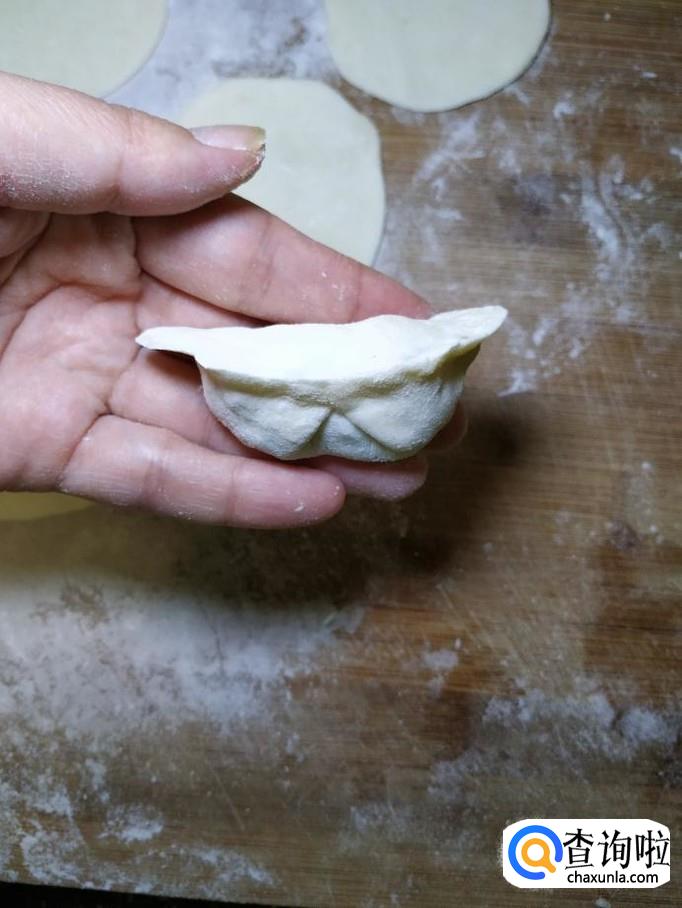 将做好的馅放在面皮中,然后按照图中所示的方法,包成饺子的形状。