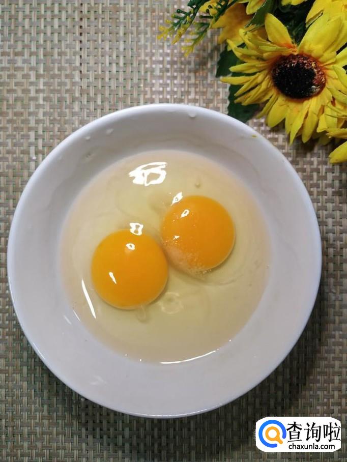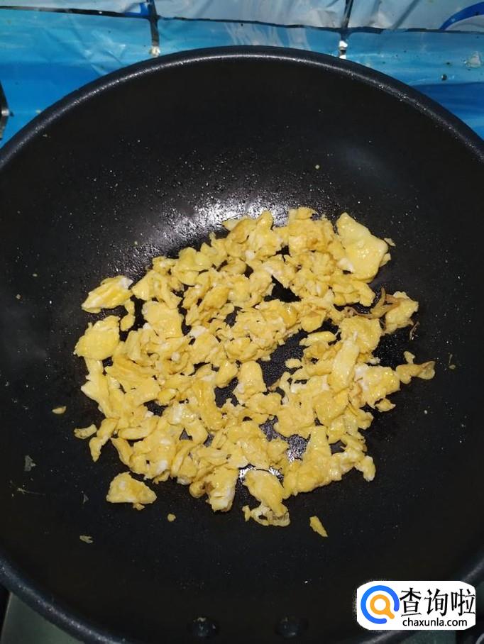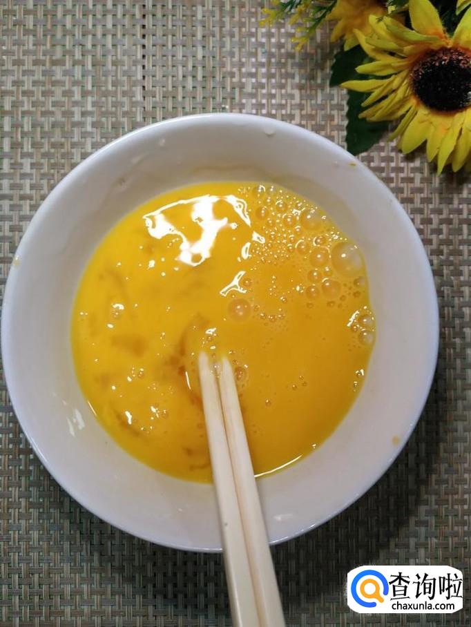 碗中打入两个鸡蛋,加入少许盐,打散,平底锅加入比平时多一些的油,然后将鸡蛋放入锅中炒香。