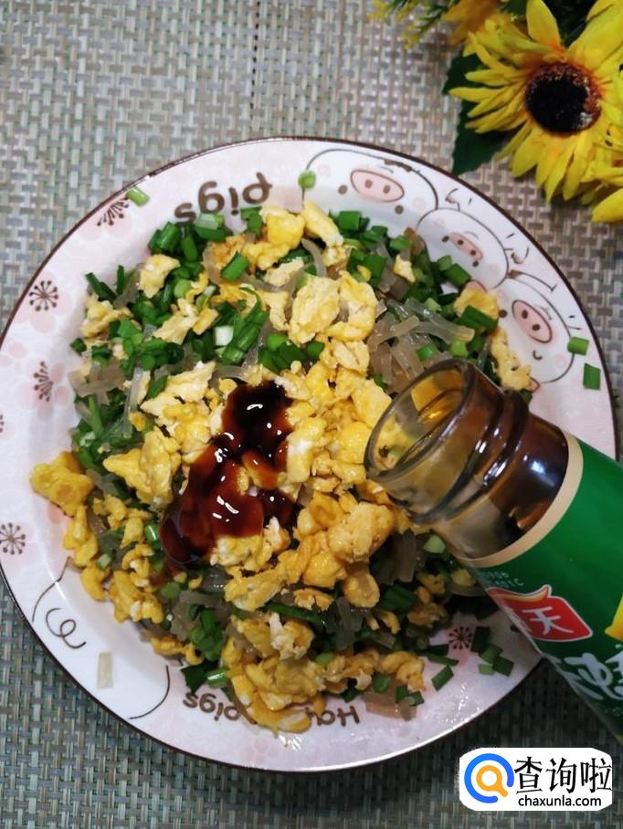 将鸡蛋,韭菜,粉条放在一起,加入适量盐,鸡精,五香粉,生抽,蚝油,搅拌均匀,馅就做好了。