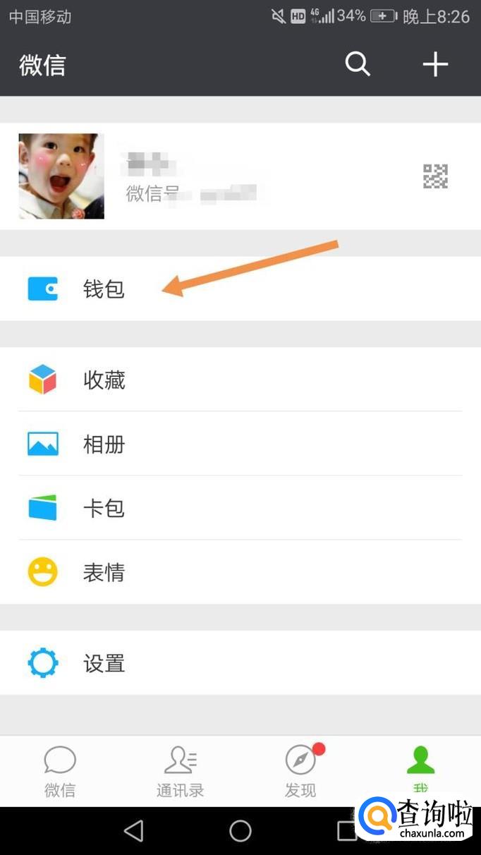首先打开微信,点击“我”,打开里面的钱包,如下图。