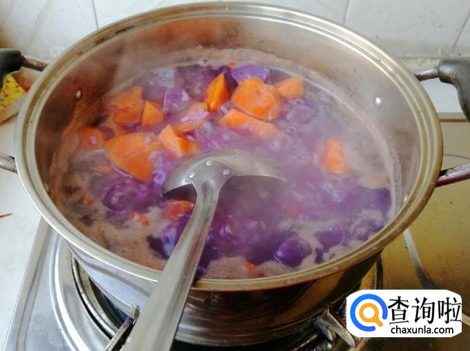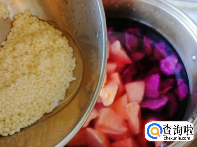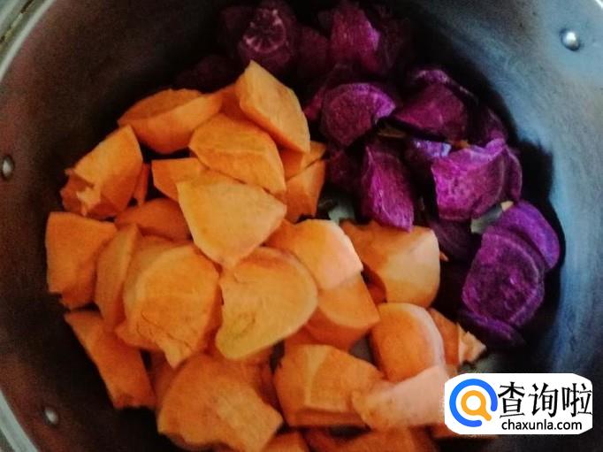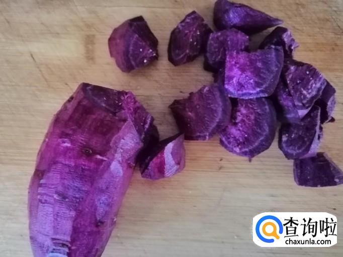 把去了皮的紫薯和黄心地瓜用刀砍成块状,不要直接用刀切,先用刀在地瓜上切一点口,然后用刀往外掰,不要紫薯和地瓜不是齐口就好,这样用刀掰是为了容易煮熟。