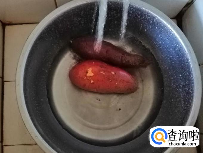 把准备好的地瓜和紫薯,让入洗菜盆用清水冲洗干净,因为地瓜上泥土很多,应该多用手搓洗几遍,洗净用刮刀去皮待用。