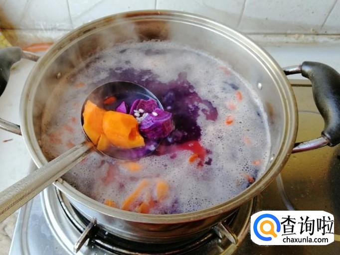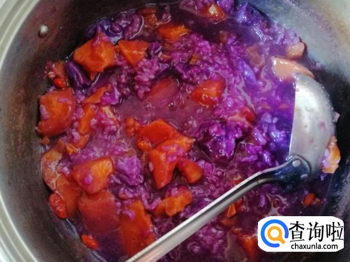 把煮锅食材都备好后开火开煮,先大火煮开,然后改小火慢炖,大约二十多分钟分钟后,查看煮锅的变化,米和紫薯都已变松软,我们的紫薯枸杞糯米粥就如图煮好了。