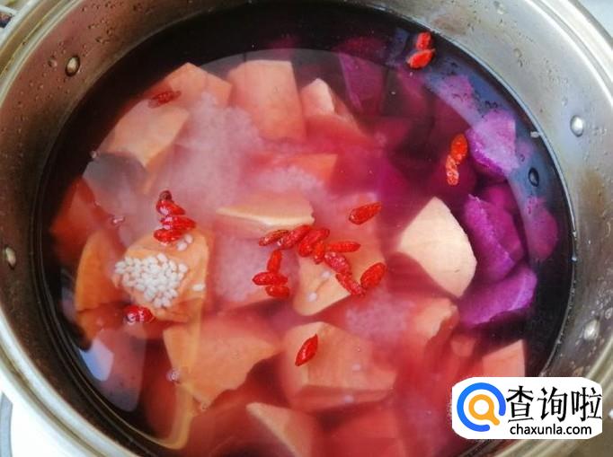 把之前砍好的地瓜块和紫薯块放入煮锅中,加入刚才淘洗好的糯米,还有备好的枸杞,加适量水就可以了。我这是用凉水下锅煮的,最好是用温热水煮粥更好。