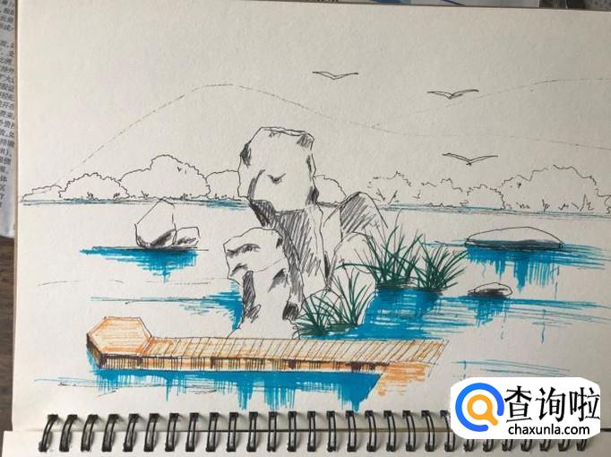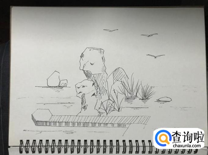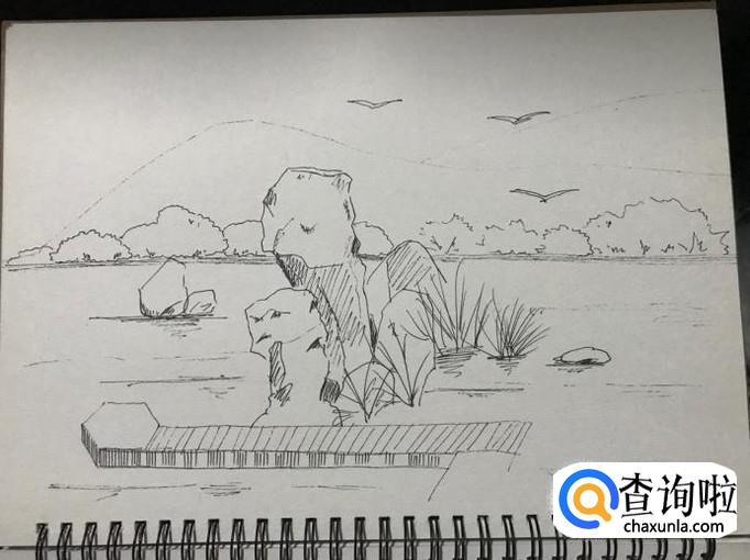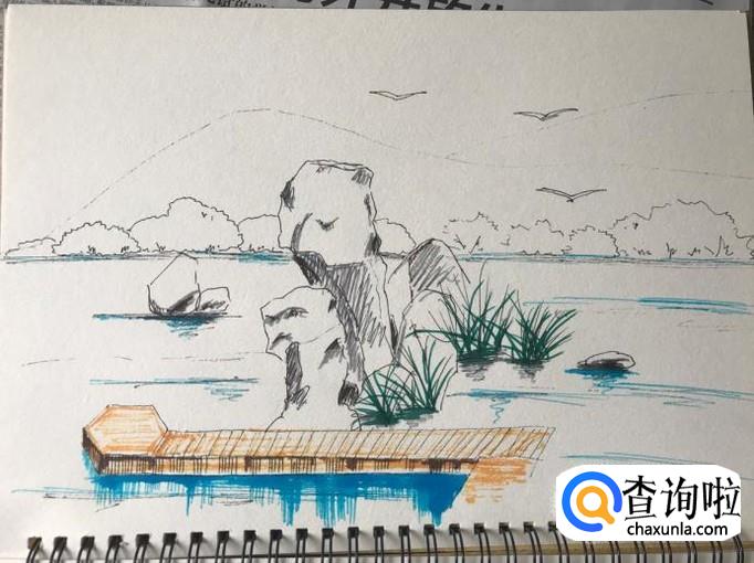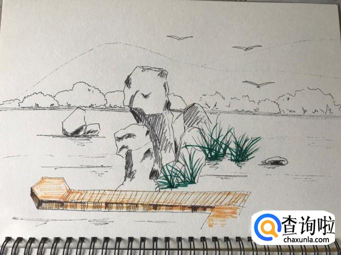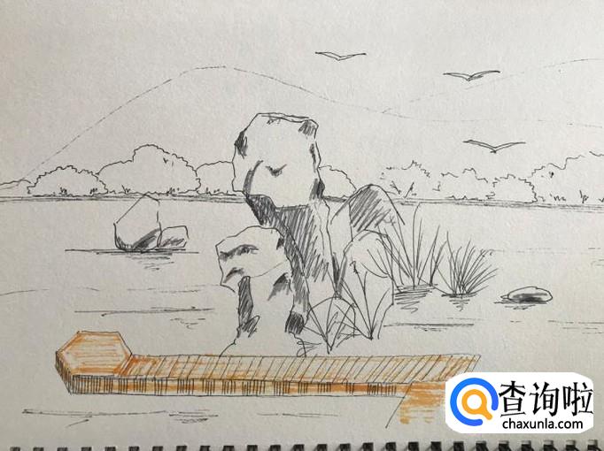 然后我们要绘制周围的碎石,远处的飞鸟等等。画出一丝一丝的水纹。碎石要大小不一,同时也要点缀一些植物。