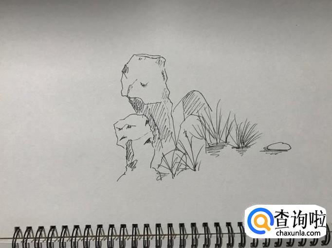 我们要对石块进行刻画,其他两石块也要绘制细致,同时要绘制石块周围的植物,这样的植物最好画出凌乱的感觉,一般滨水植物都是紧挨着的,一簇一簇生长。