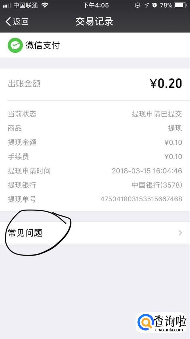 然后我们可以看到近期交易记录,选择提现未到账的订单,点击进入,选择“常见问题”,点击最下方的“联系客服”即可。