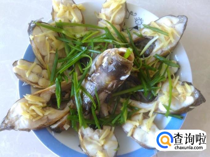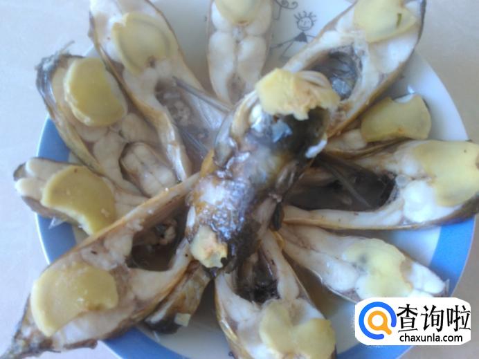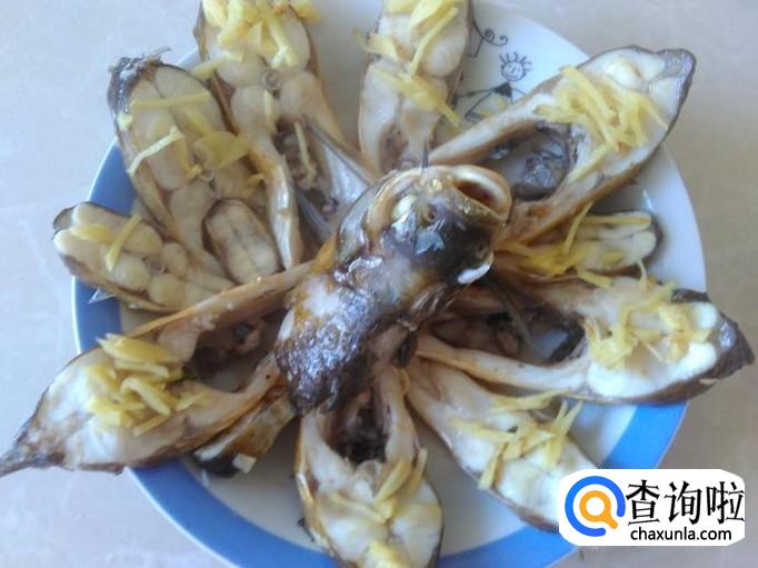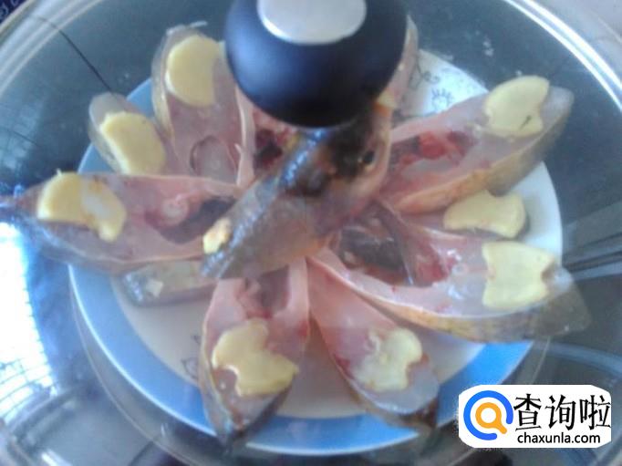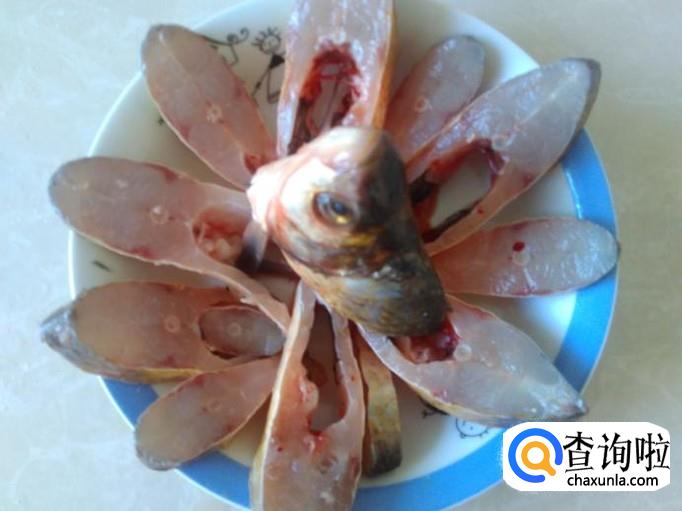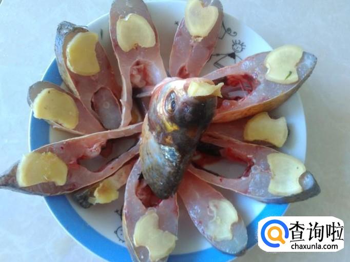 然后把鱼身切成半寸厚一片,再均匀地摆在碟子里,然后用姜片贴到鱼片上。