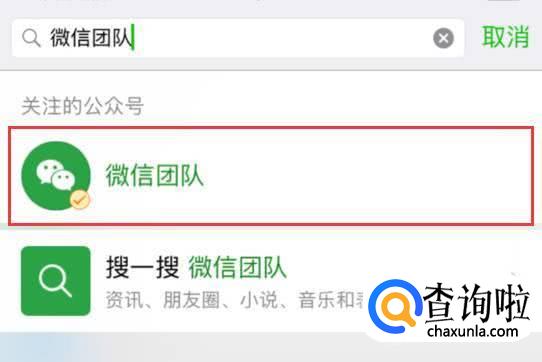 现在我们看一下帮忙解封的账号好友要怎么操作,其实很简单,只要在微信上方的搜索栏,搜索“微信团队”。