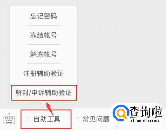 点击左下角的自助工具,选择【解封/申诉辅助验证】。