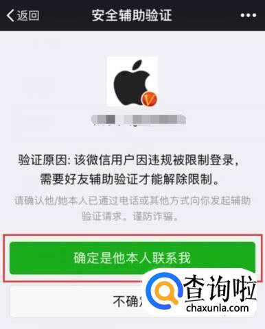 然后在安全辅助验证岩棉上,点击【确定是他本人联系我】。