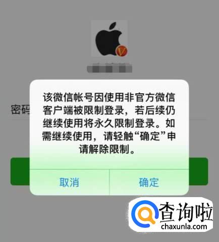 微信账号被封,打开微信时会弹出提示“该微信账号因使用非法客户端登录被限制登录,若后仍继续使用将永久限制登录。如需继续使用,请轻触“确定”申请解除限制”,点击【确定】。