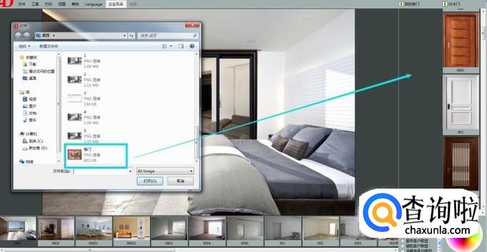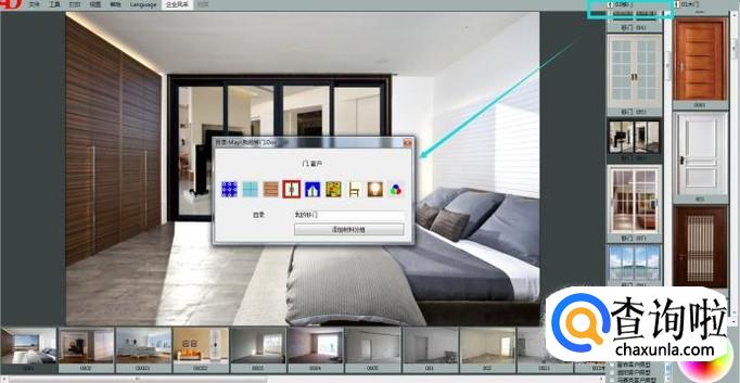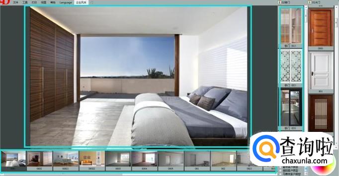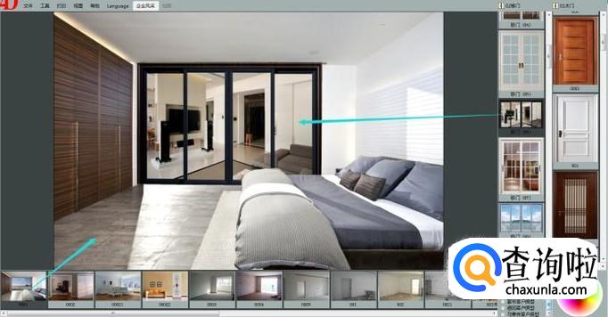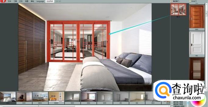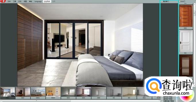 首先我们打开移门效果图软件,简单介绍一下界面。软件大致分三个部分,中间是我们的效果展示区域,下方是我们的房型图展示区,右侧是我们的建材产品区域