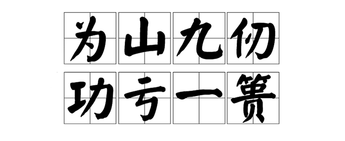 吃饱喝足之后,他又想,反正只有一筐土而已,过几天再堆也不迟,于是就美美的睡觉休息。从此以后,他总认为只有一筐土而偷懒,所以这一筐土至死他也没堆上,终究这座只差一筐土的九仞高的山还是没有堆成(为山九仞,功亏一篑)。最后,他所堆的九仞山因为雨水冲刷,最后倒塌了,他辛辛苦苦干了那么久,就差最后一筐土,可是总是以各种理由借口不去堆,最后导致山倒塌,以前的所有辛苦和努力都前功尽弃。“功亏一篑”一成语便出于此。这个成语告诉我们无论做任何事,都要有始有终,踏踏实实,坚持到底,否则,虽然只差一点,也会前功尽弃。