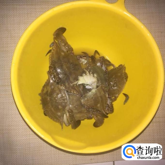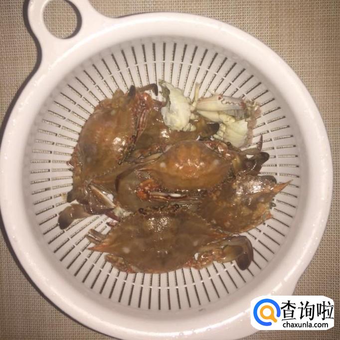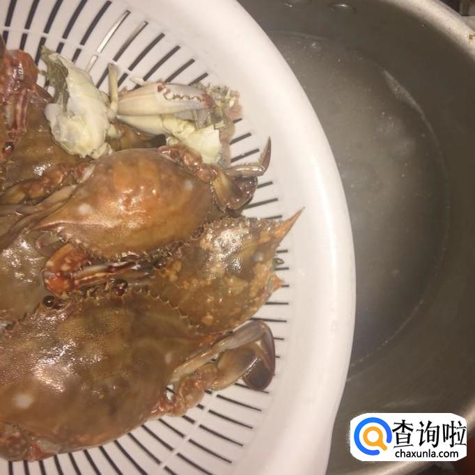 然后把处理好的螃蟹对半切开,锅中放入适量的清水,待水烧开,倒入螃蟹烫5分钟,捞出沥干。