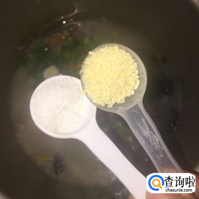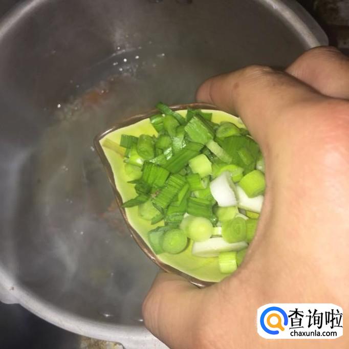 接着把香葱切成葱花倒进锅中,然后往锅中加入一勺的盐和一勺的味精并用勺子搅拌均匀,这样就可以出锅了。