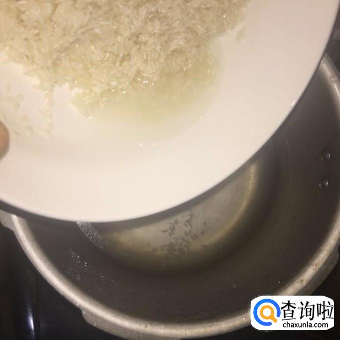 接着往高压锅中加入适量的清水,倒入泡好的大米。