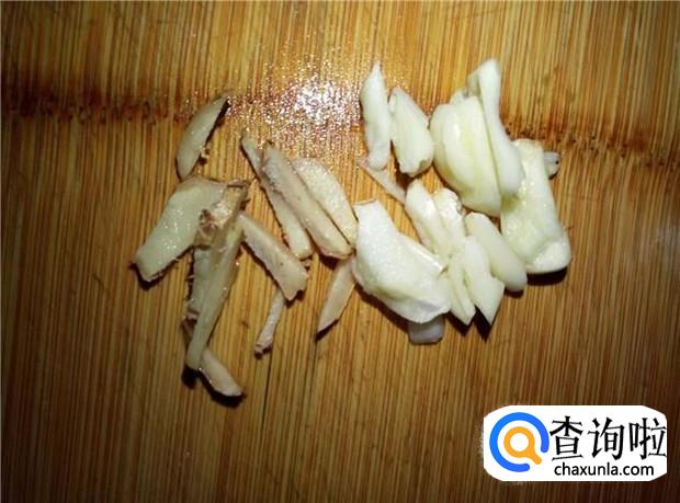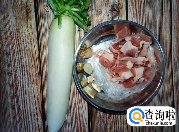 准备好所有材料:后腿肉半斤、白萝卜一根、姜适量、蒜头三瓣。