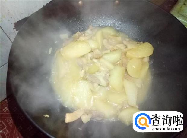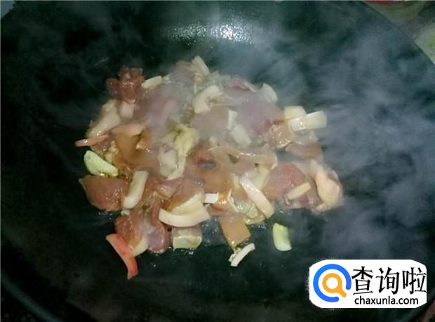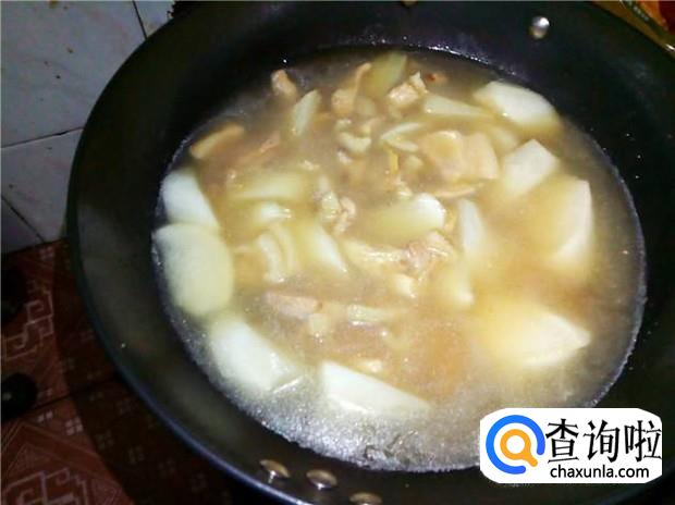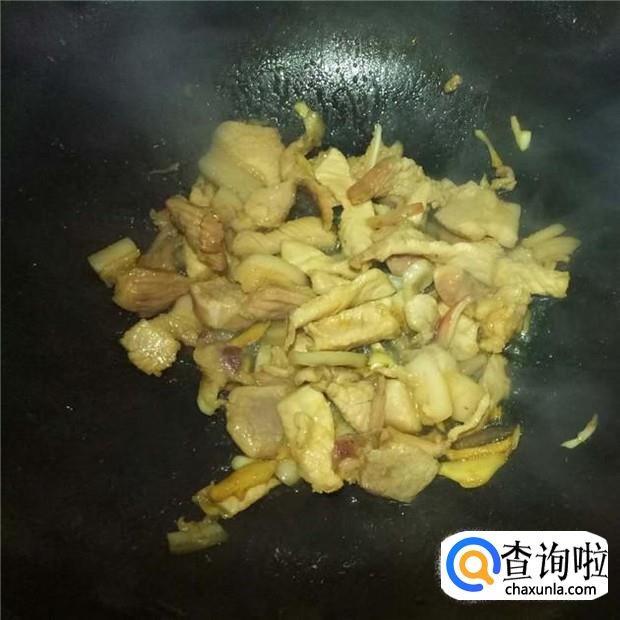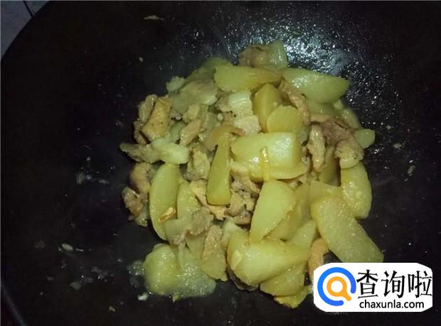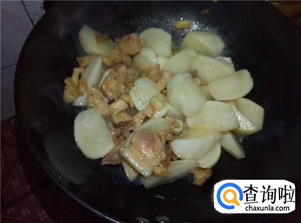等到后腿肉变颜色后,倒入切好的白萝卜,翻炒到白萝卜入味,加入适量的盐。