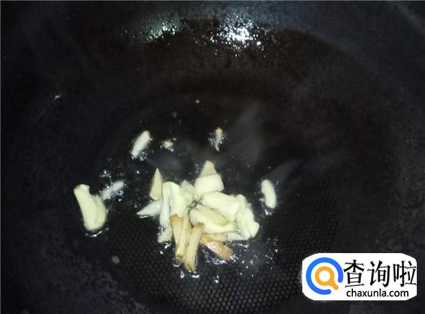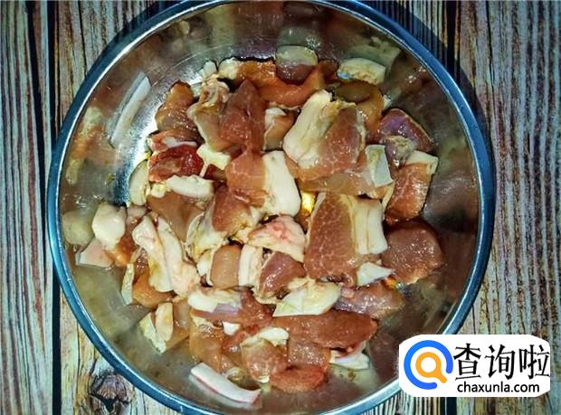 后腿肉切薄片,加入酱油和料酒,腌制十分钟。