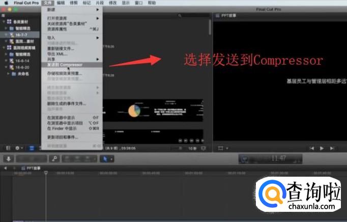 我们选中视频文件,然后点击顶部的文件菜单,接着选择发送到Compressor选项
