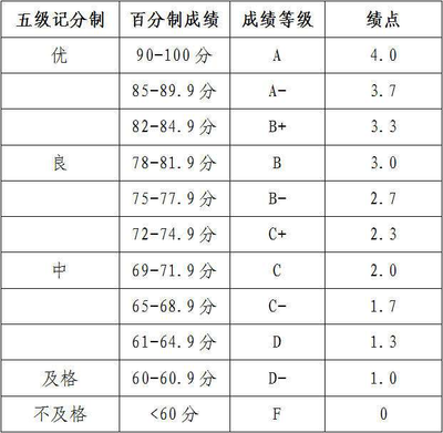 早在1999年起就开始采用GPA衡量学生学习质量,几年来这种方法已逐步被大家所理解、接受。平均学分绩点换算的方法为把各科成绩按绩点数乘以学分,再以总学分除之。分数成绩和绩点数的换算如下:90-100分=4.0;85-89分= 3.7;82-84分=3.3;78-81分=3.0;75-77分=2.7;72-74分=2.3;68-71分=2.0;64-67分=1.5;60-63分=1.0;60以下=0。如果一学期修了三门课,英文3学分(成绩4点)、历史3学分(成绩2点)物理3学分(成绩3点)。那么GPA是(4×3+3×2+3×3)÷9=3。